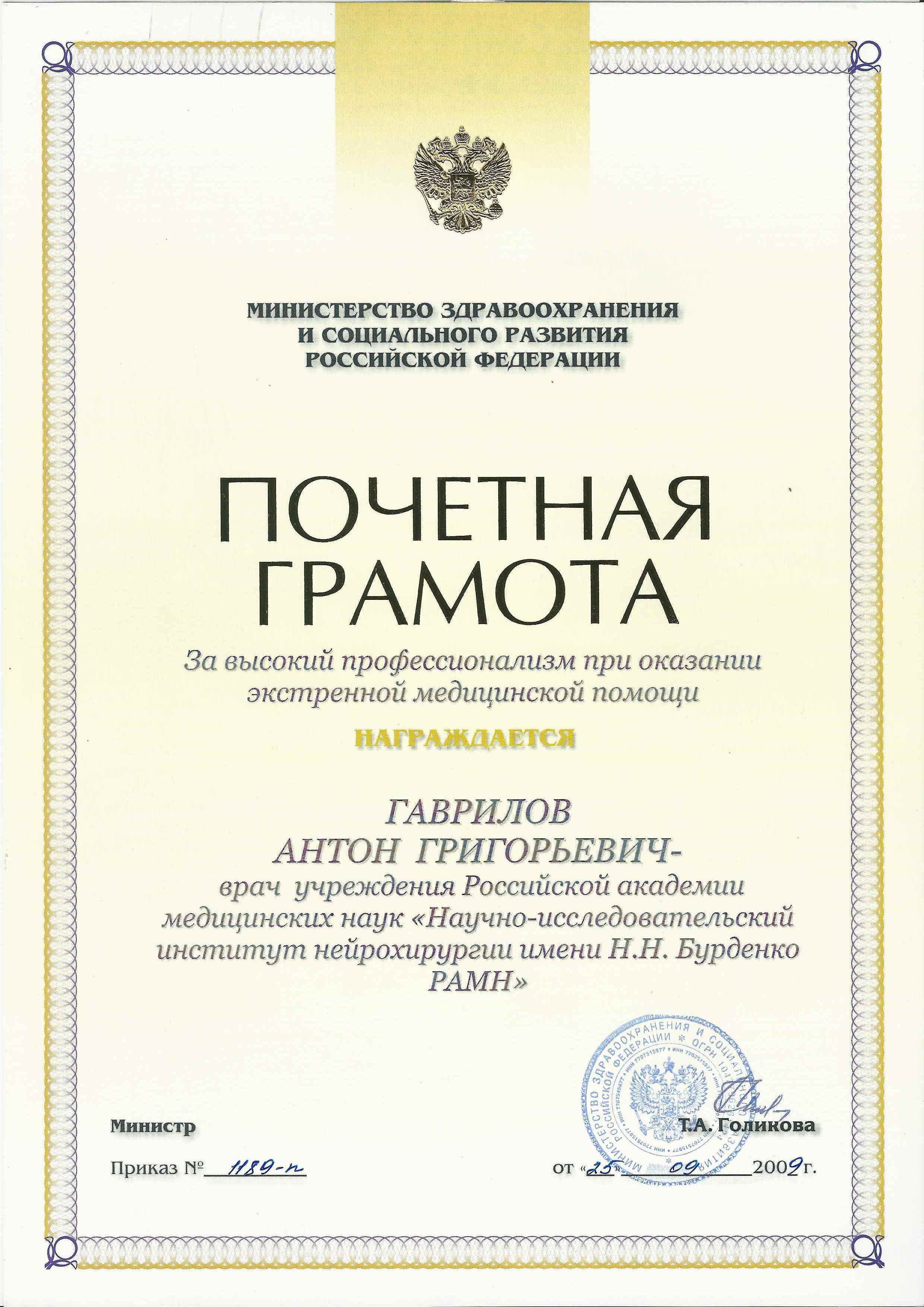 За высокий профессионализм при оказании медицинской помощи. Приказ № 1189-п от 25 сентября 2009